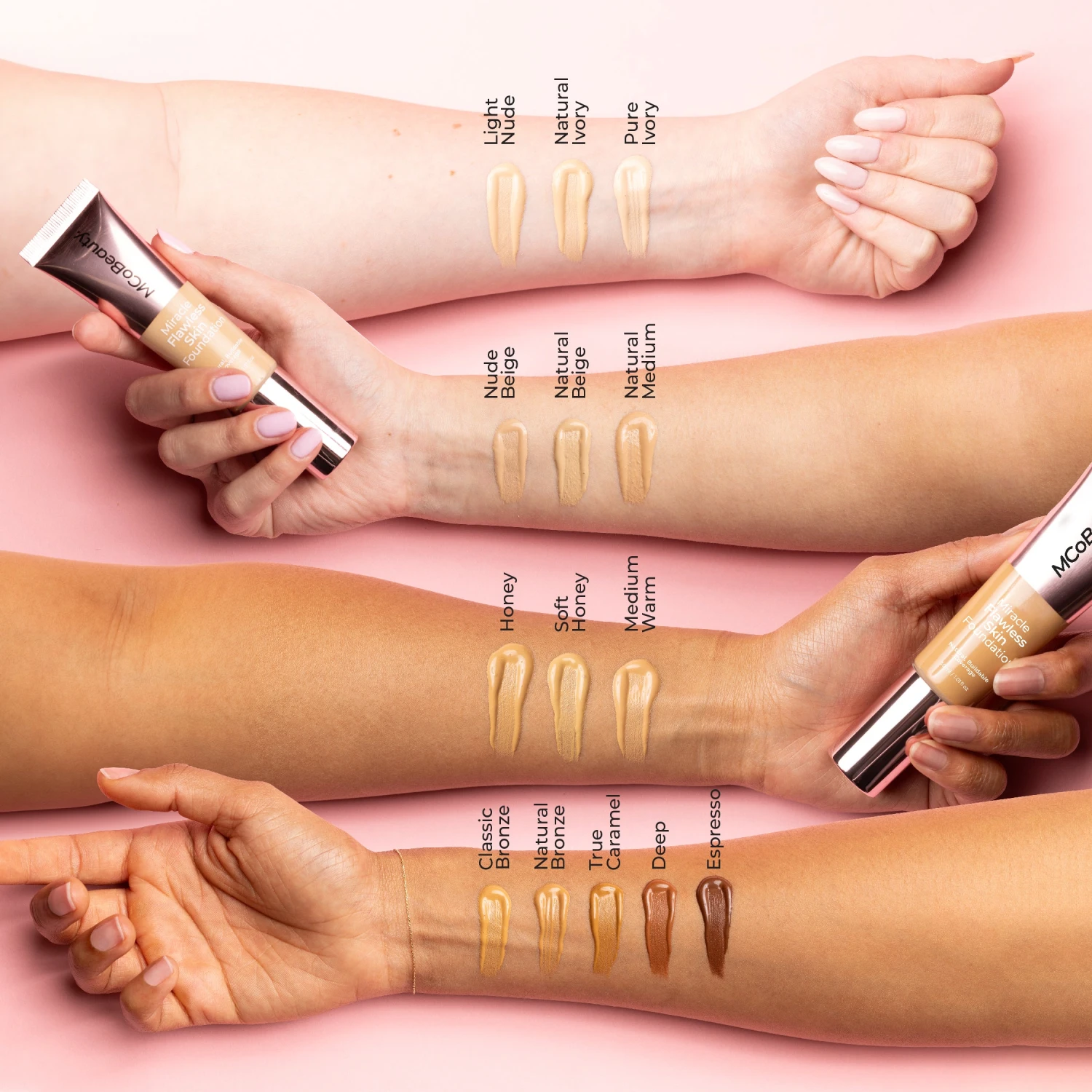 A 2-in-1 foundation and skincare powerhouse, the MCoBeauty MIRACLE FLAWLESS SKIN FOUNDATIONÂ has a creamy formula, that evens skins texture with buildable, medium coverage. The skin-nourishing ingredients help give boost moisture retention while smoothing and comforting skin. A fusion of Hyaluronic Acid and Coconut Water is blended with Rose Flower Water to work over time to revitalise skin’s texture. The addition of Bixa Orellana Seed Extract reduces shine while respecting skin’s natural glow, making this the ultimate daily foundation for healthier and refreshed looking skin.